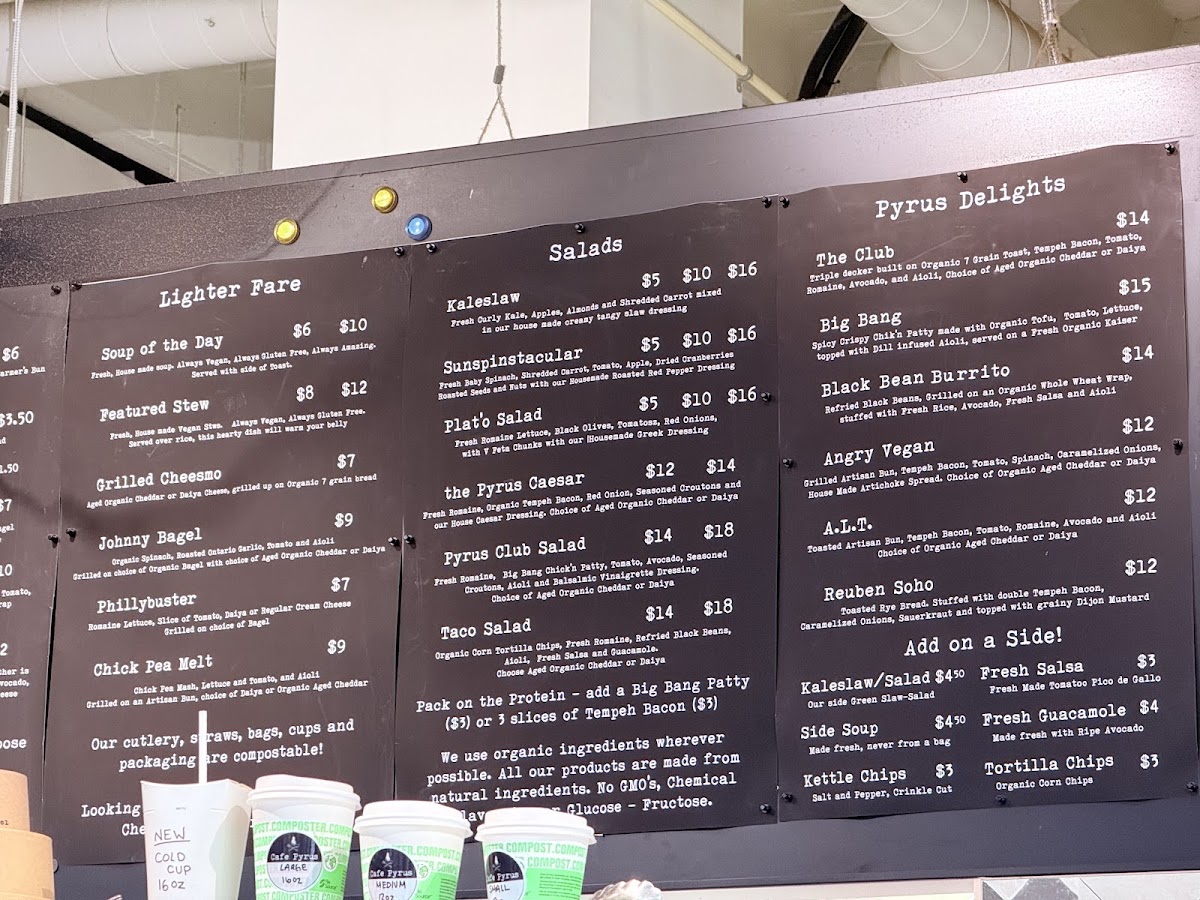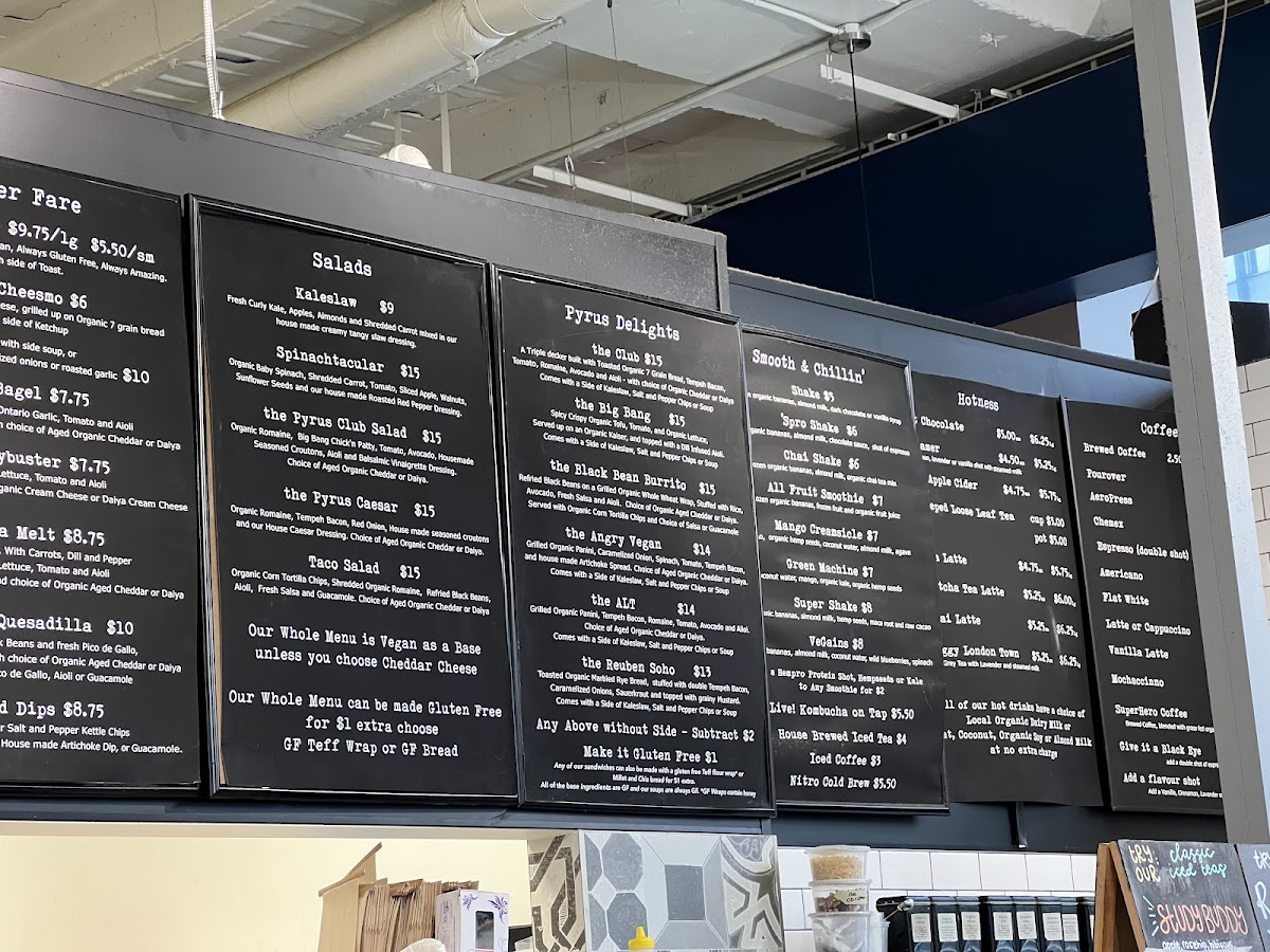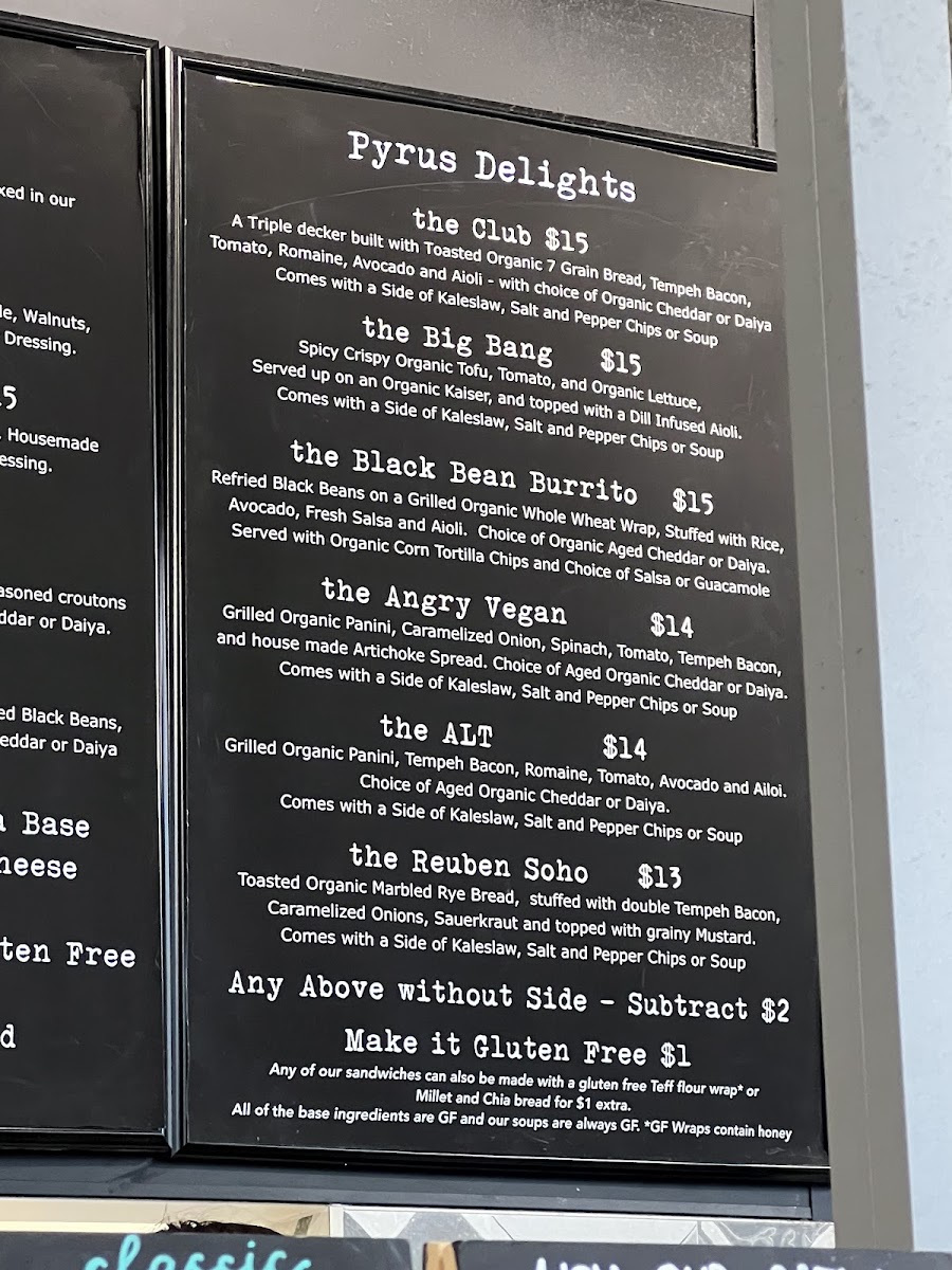 The menu boasts an array of fresh salads such as the Kaleslaw and the hearty Pyrus Caesar, perfect for health-conscious diners. Breakfast enthusiasts will find joy in offerings like the Coconut Yogurt Parfait and the filling Breakfast Wrap. The incorporation of unique beverages such as Goji Acai Sencha adds a refreshing touch.